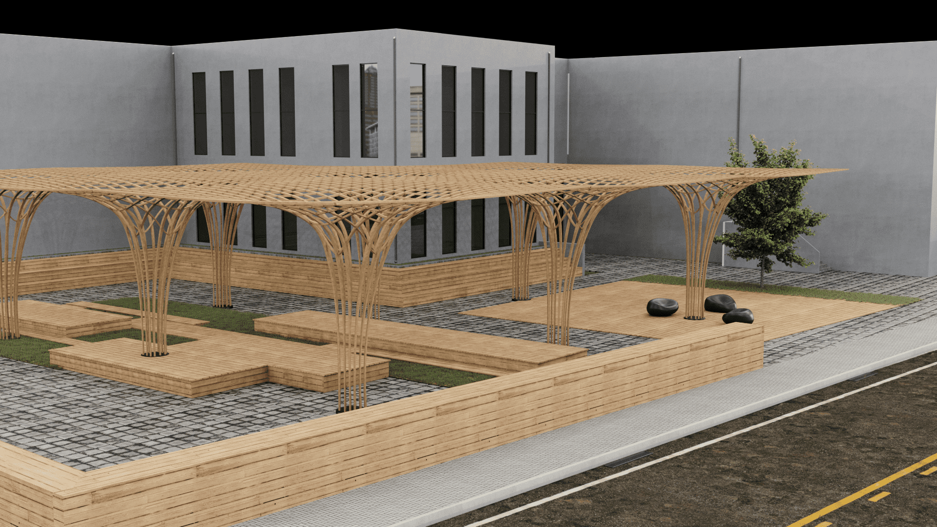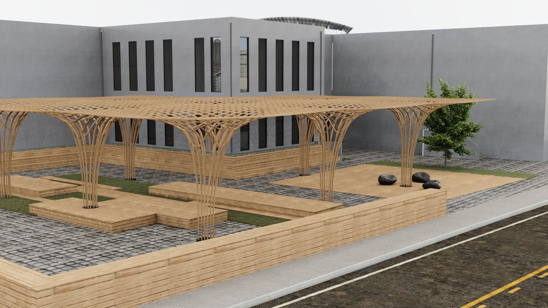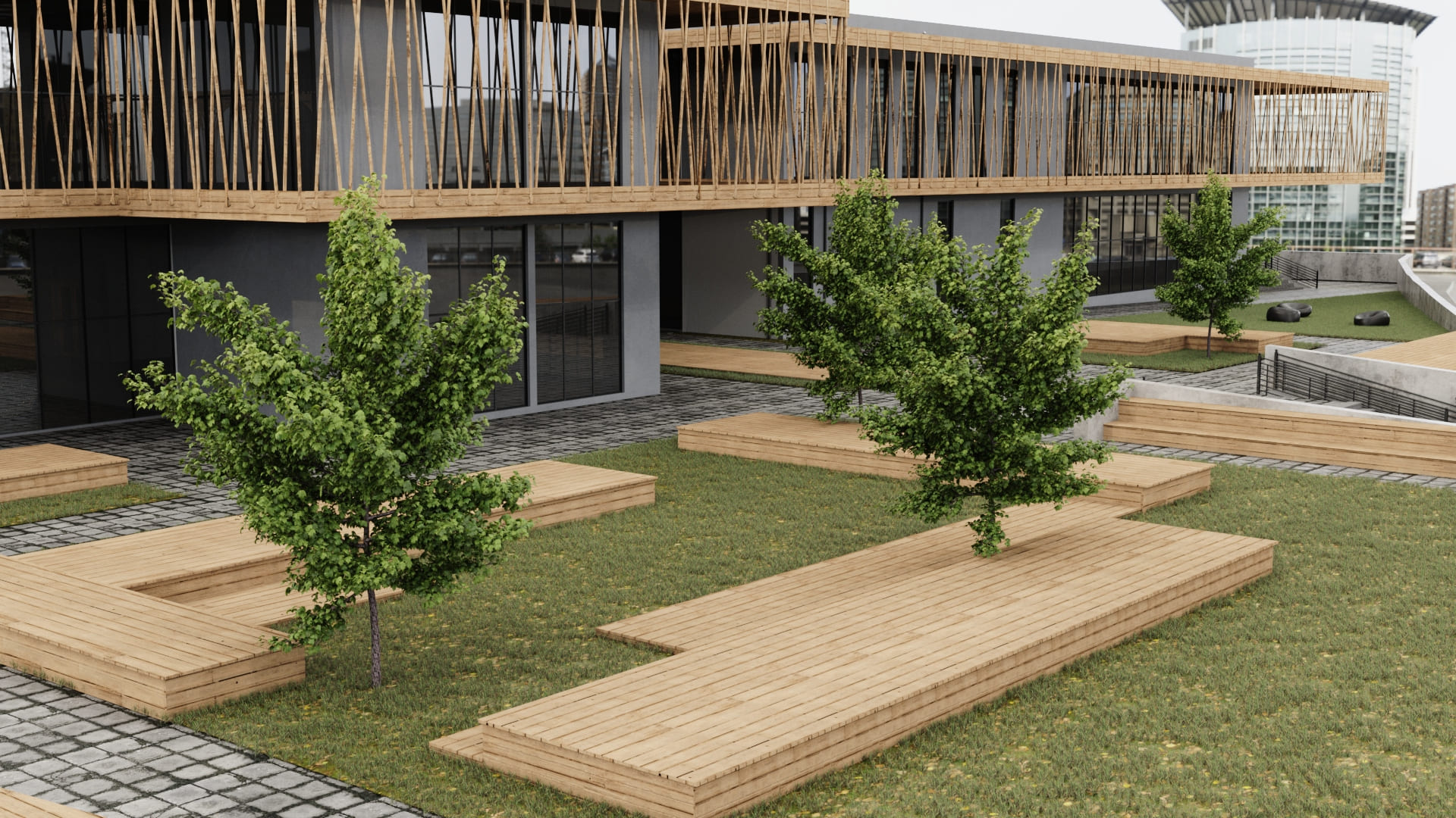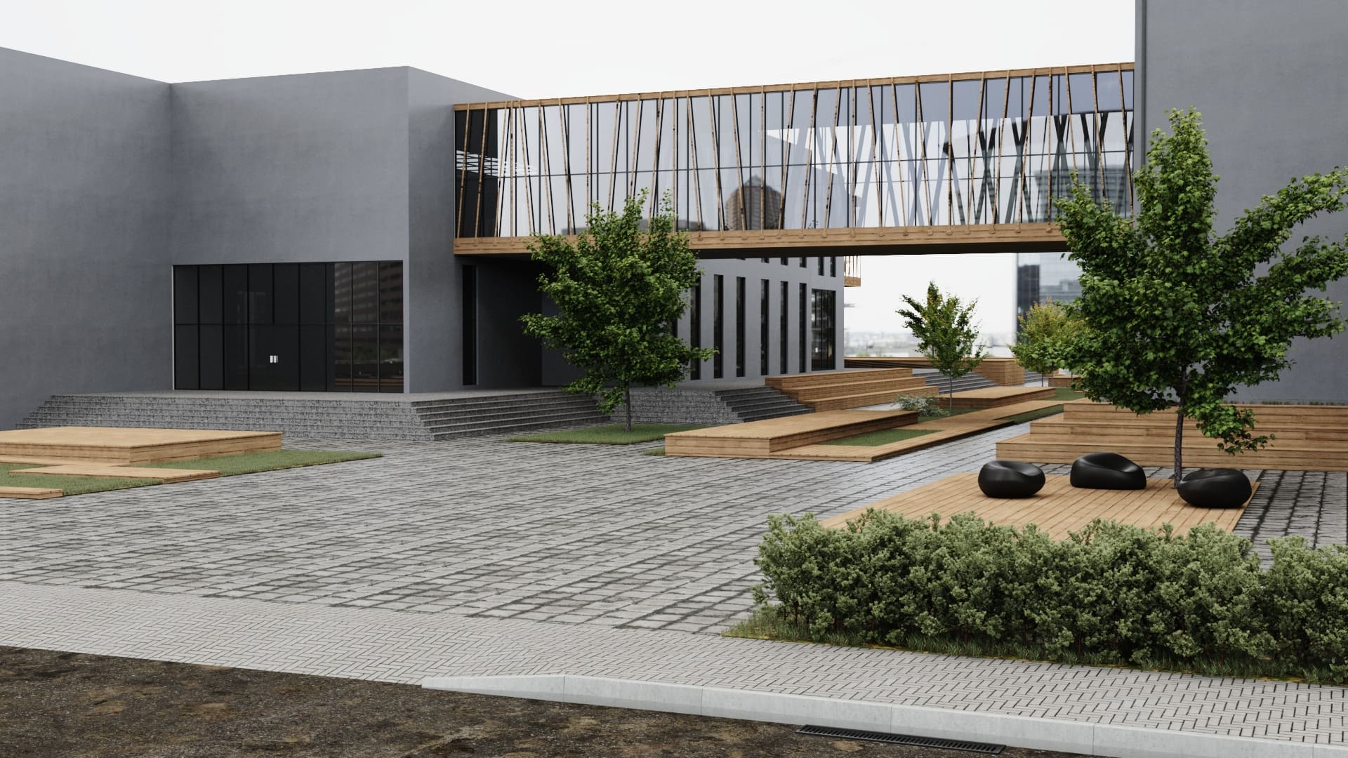 Dış cephesinde ahşap strüktürler ve kompozit cephe kaplama elemanları tercih edilmiştir.